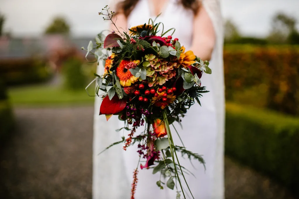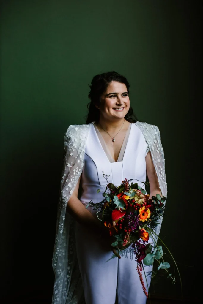These epic bouquets were filled with the colours of autumn and looked ravishing against this white jumpsuit. Accentuated furthermore by its flowing cape, this bridal look was one that took our breath away. Capes adorned with botanical appliqué like this are simply mesmerising and bang on trend for 2023.