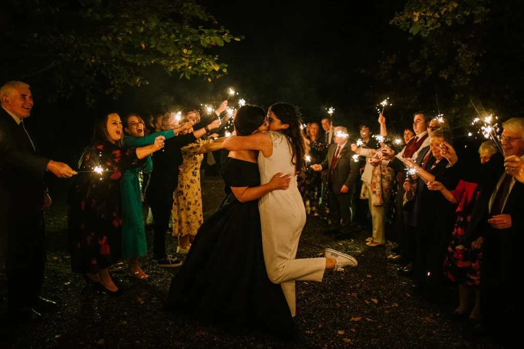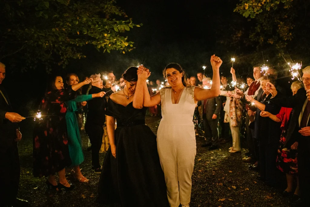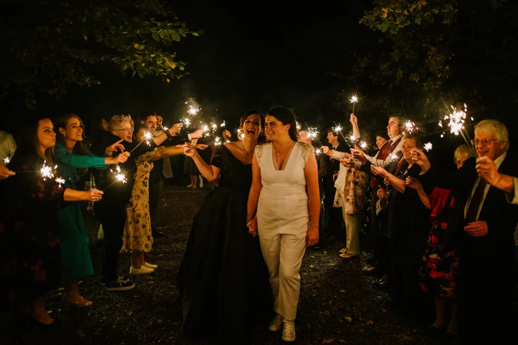 After their meal and fabulous cake was devoured, the couple partied long into the night with all of their nearest and dearest. Not, however, before they were initiated into married life by a sparkler tunnel from their loved ones!