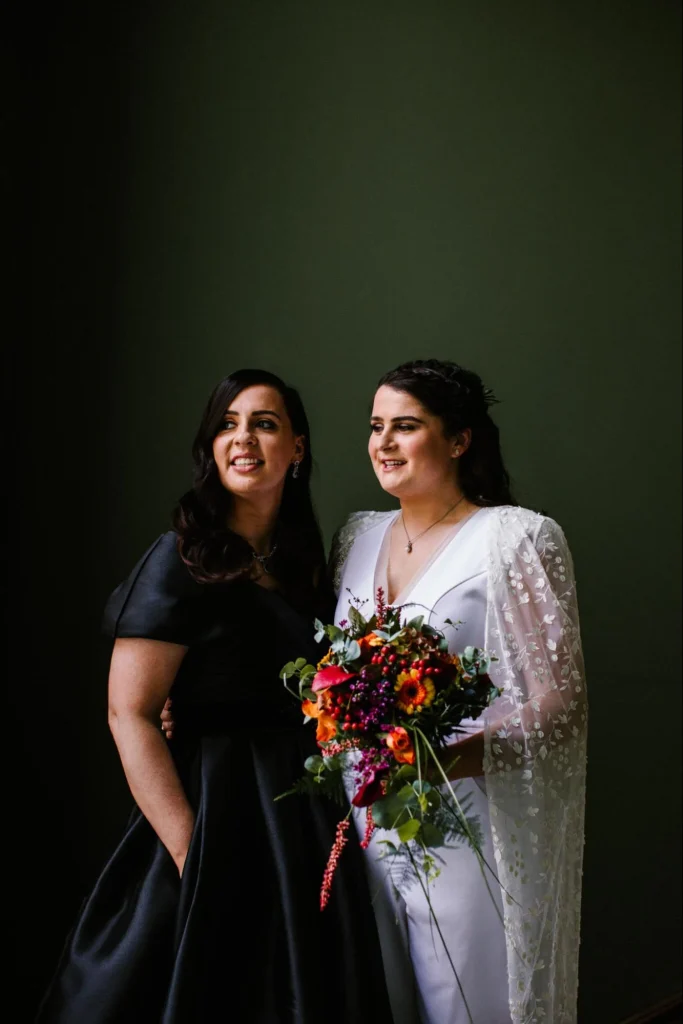 Jaimie’s silk ballgown was paired beautifully with the eucalyptus and cabbage roses in her hoop bouquet as well as eye-catching black and diamond drop jewellery and old hollywood waves. Rachael paired her look with milk thistle, eucalyptus, orange gerbera, roses and deep purple calla lilies, as well as some delicate pearls.