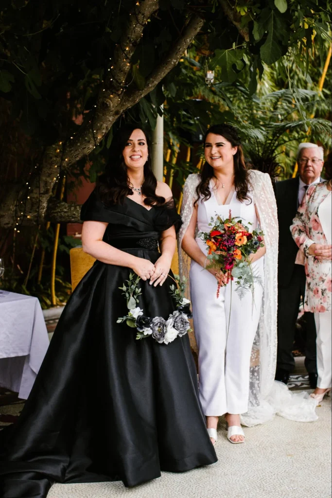 Jaimie kept her black wedding dress a secret until the big day and Rachael was blown away by her beautiful wife-to-be! These bridal looks complemented each other perfectly and we just adore the dropped shoulder ballgown in an effortlessly elegant shade of raven.