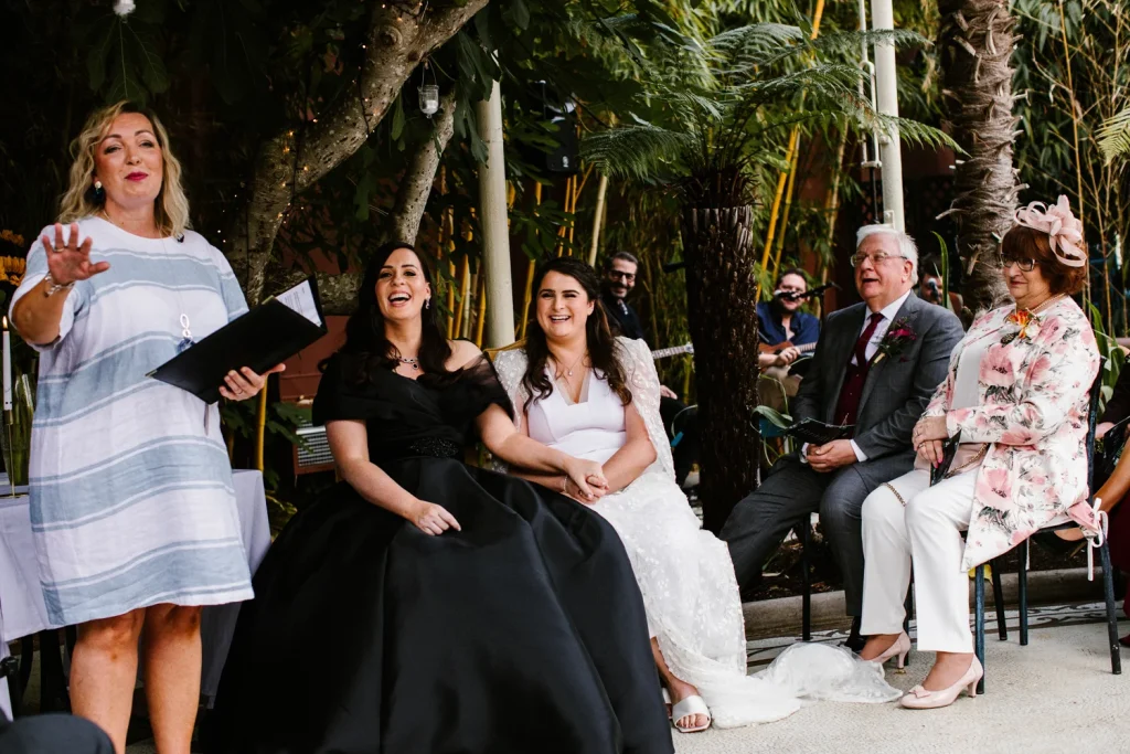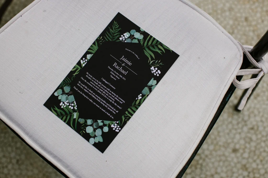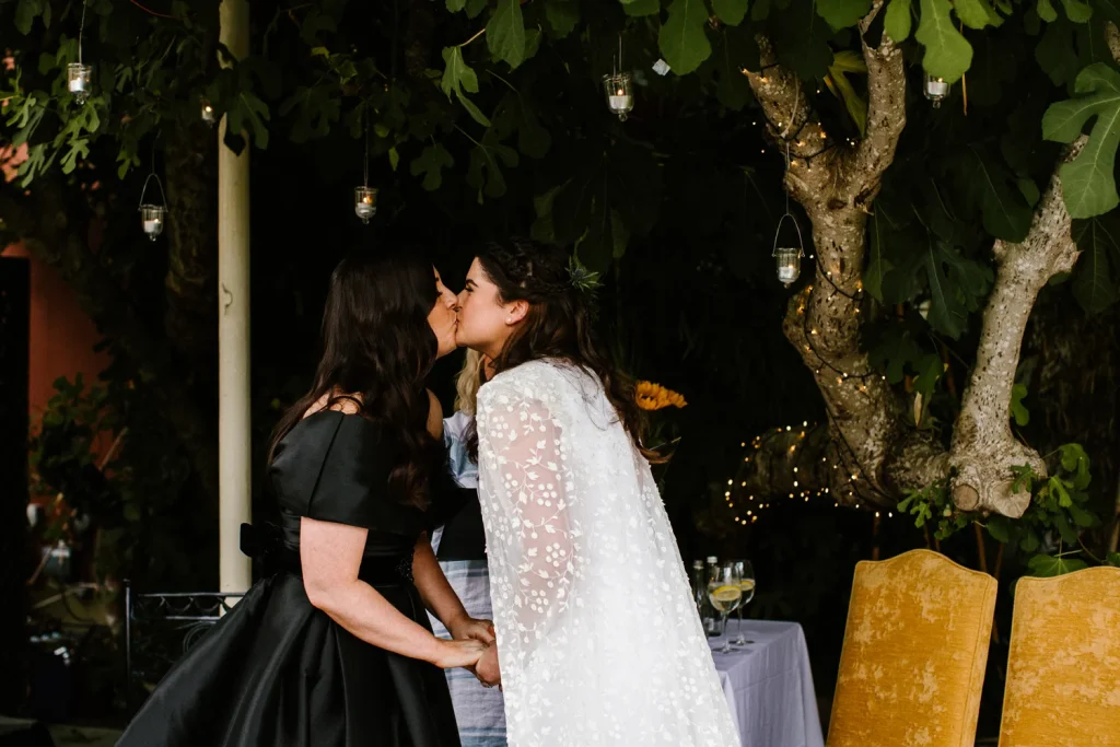 Jaimie and Rachael, a loving couple, share a tender moment during their wedding ceremony, surrounded by beautiful decorations and joyful guests.